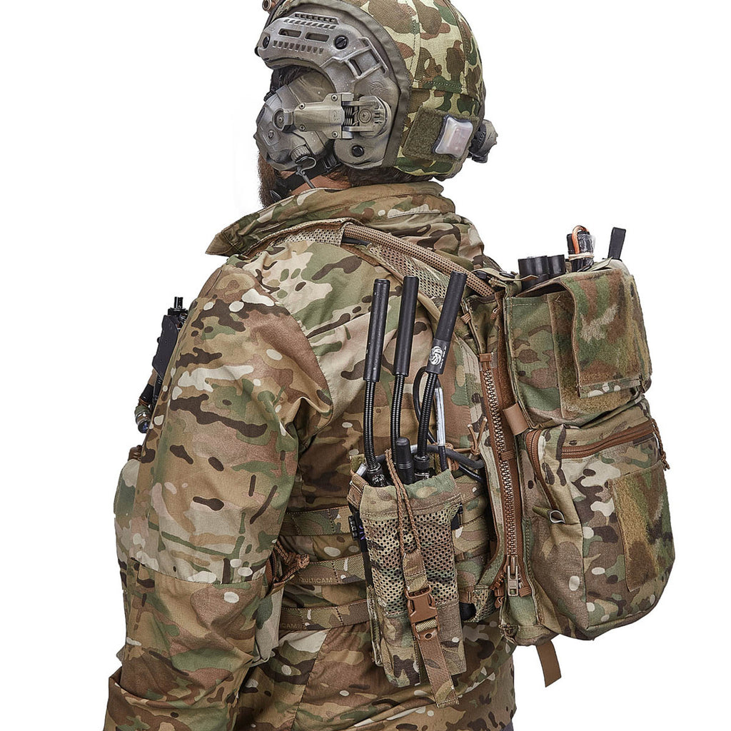 A removable flap system allows the top portion of the panel to be reconfigured for different mission profiles. Flaps (sold separately) can be swapped quickly using the dedicated double-pull zipper system, which also provides routing paths for antennas, cables, hydration tubes, and breaching tools, as well as rapid internal access without lifting an entire flap.